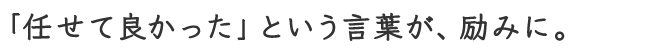一方で、オーナー様とじっくりコミュニケーションを取ることも大事にしています。仕事とは直接関係ない世間話を重ねることで、少しずつ人間関係が構築されていくからです。オーナー様の中には高齢の方も多いのですが、可愛がってもらっていますよ。時にはトレーニングなどの趣味の話で盛り上がったりします。